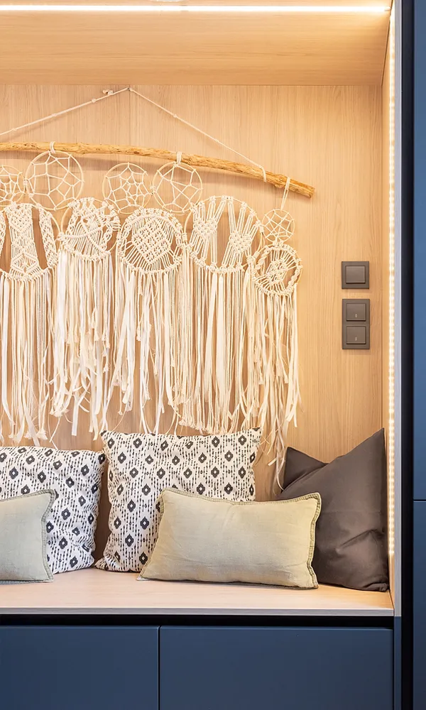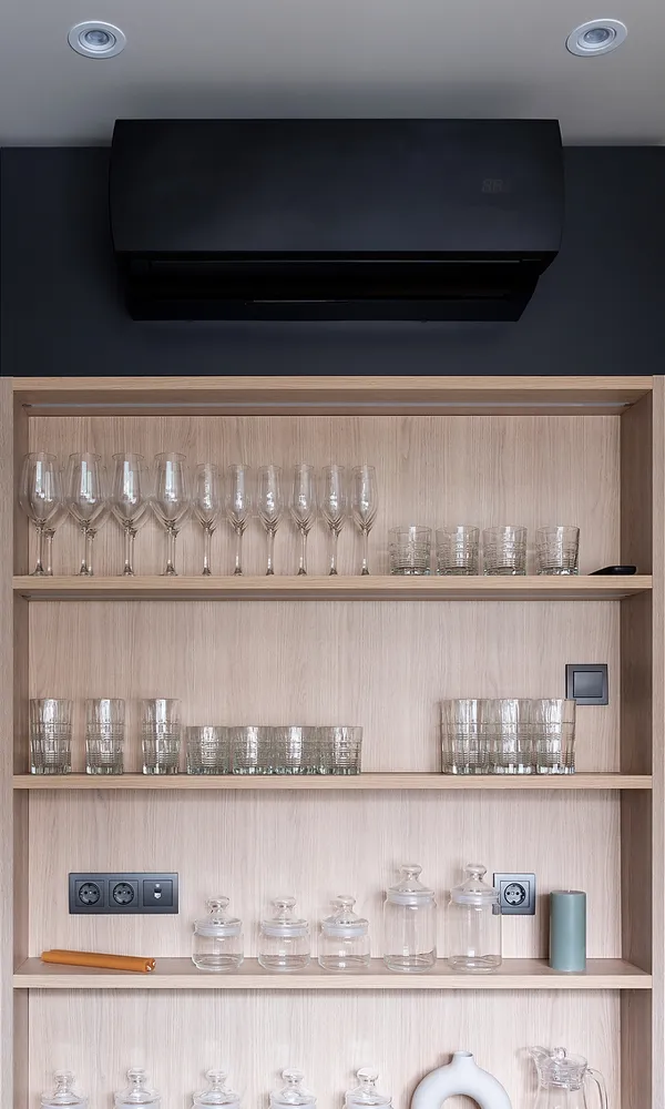 Тёплые сливочные тона кухни разбавили тёмными фасадами цвета сажи, добавив интерьеру глубины и контраста. Идеально ровный потолок украсили встроенные споты 9914 LED, которые стали основным источником верхнего света. Эти светильники создают эффект «света из ниоткуда», благодаря чему кухня выглядит современно и стильно .