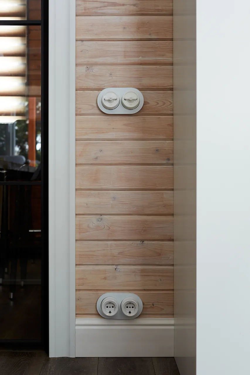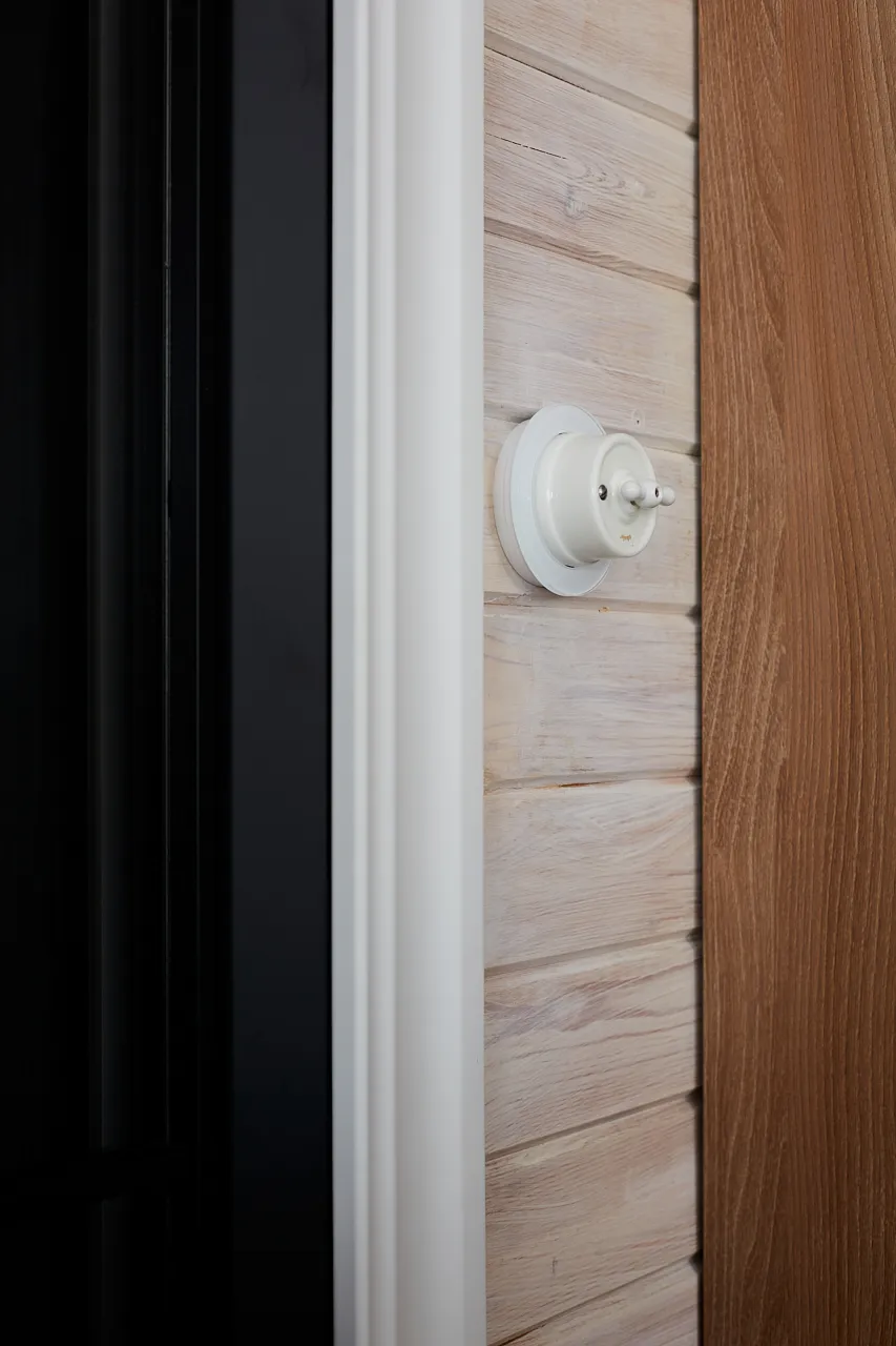 В обновленный интерьер гармонично вписались розетки и выключатели Werkel™. Одни изделия выполнены в изящных рамках из закаленного стекла, добавляя пространству современной элегантности. Другие представлены в накладном ретро-стиле, подчеркивая дачную атмосферу и создавая контраст между традициями и современностью. Особое внимание привлекают выключатели с тумблерами, которые стали стильным акцентом в интерьере.